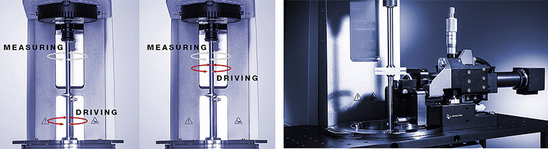 在反向運動模式下,流變儀將兩套空氣軸承 EC 馬達均用作驅動裝置和扭矩傳感器。兩個馬達可以輕松設置為以相反方向旋轉,這可以用來在測量樣品中形成固定的停滯面,以便采用顯微鏡進行剪切條件下材料的先進結構分析。此模式也可以與通用拉伸夾具結合使用,以便在最小的測量扭矩下進行拉伸測量。就速度而言,反向運動模式更讓測量工作“事半功倍” — 最高速度差高達 6000 rpm,這大大拓寬了高剪切應用的剪切速率范圍。