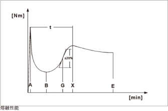 該軟件能夠分析曲線,并確定在轉(zhuǎn)矩曲線(用于測量粘度)、熱融合時間、凝膠速度和機械能輸入這三者中的極值。