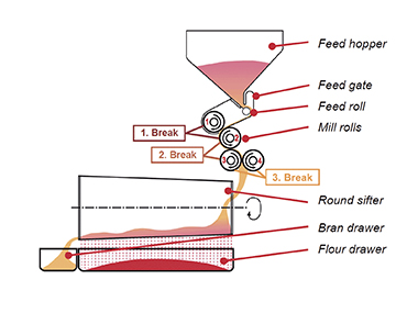 原理:這一封閉的研磨過程確保胚乳和皮層的最大限度的分離。這種與麩皮彈性相適應的較短研磨過程還可避免麩皮破碎。經過最后一對磨輥后,物料進入圓筒篩,篩分成面粉和麩皮。