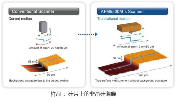 AFM5500M搭載了最新研發的水平掃描器,可實現不受圓弧運動影響的準確測試。