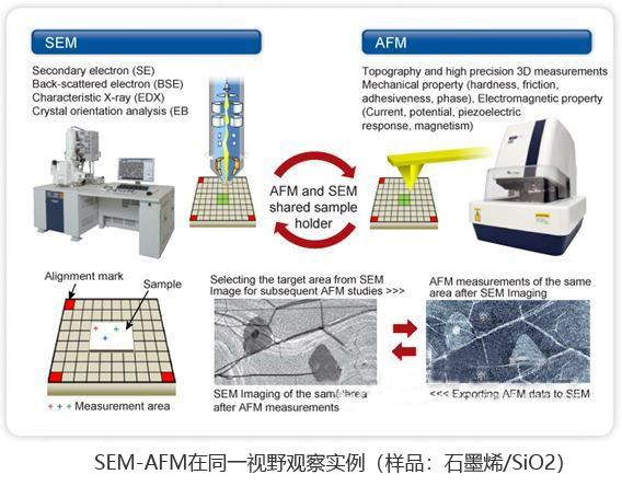 通過SEM-AFM的共享坐標樣品臺,可實現在同一視野快速的觀察分析樣品的表面形貌,結構,成分,物理特性等。