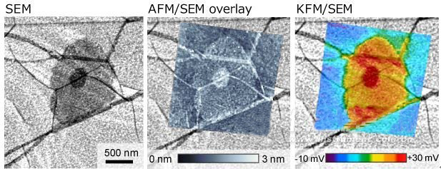 上圖是AFM5500M拍攝的形貌像(AFM像)和電位像(KFM像)分別和SEM圖像疊加的應用數據。
