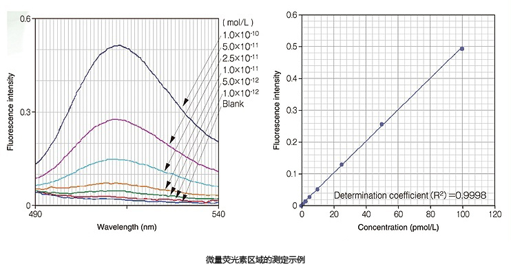 超高靈敏度在實際分析案例中體現更為明顯,以Blank(純水)為參照,使用F-4700可檢測低至1×10-12mol/L(亞皮摩爾)量級的熒光素。從線性曲線圖可知,即使在痕量區域,也能獲得很好的線性關系。