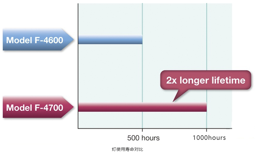 F-4700采用全新氙燈,并改良了燈電源,使得光源亮度提升,并有效延長氙燈的使用壽命至1000小時。延長燈泡更換周期可降低耗材成本,減輕燈泡更換等作業負擔。