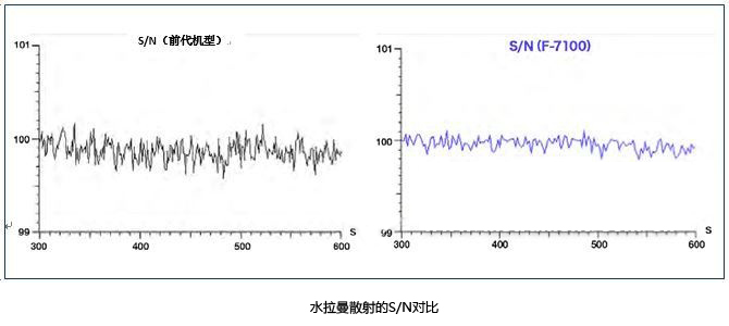 上圖所示是F-7100與F-7000水拉曼散射的S/N對比情況。F-7100靈敏度是前代機型的1.5倍,即便是微弱的信號,也能實現低噪聲檢測。