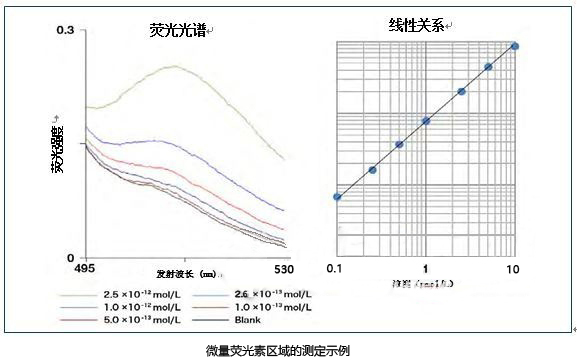 上圖表示以Blank(純水)為參照,超高靈敏度的檢測示例。使用F-7100 可檢測低至1×10-13mol/L(亞皮摩爾) 量級的熒光素。從線性曲線圖可知,即使在超微量區域,也能獲得很好的線性關系。