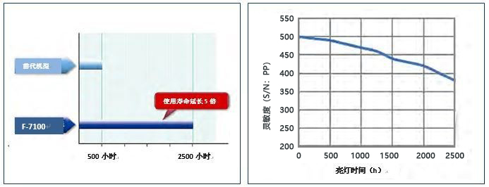 F-7100采用全新氙燈,并改良了燈電源,使得光源亮度提升,并有效延長了氙燈的使用壽命。延長燈泡更換周期可降低耗材成本,減輕燈泡更換等作業負擔(如上左圖)。由如上右圖可知,F-7100性能卓越,即使氙燈使用接近2500h,也能夠維持較高的靈敏度。