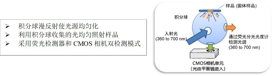 新型熒光分布成像系統(tǒng)可安裝到F-7100熒光分光光度計的樣品倉內(nèi)。入射 光經(jīng)過積分球的漫反射后均勻照射到樣品,利用F-7100標(biāo)配的熒光檢測器可以獲得樣品熒光光譜,結(jié)合積分球下方的CMOS相機可獲得樣品圖像,并利用獨特的AI光譜圖像處理算法,可以同時得到反射和熒光圖像。