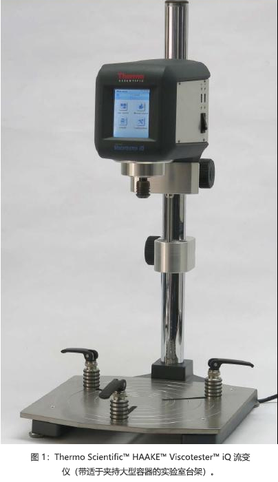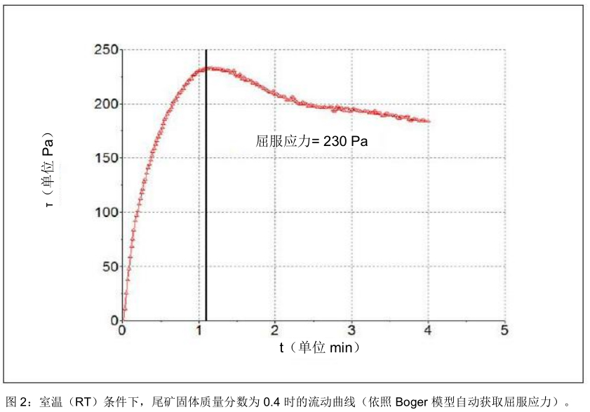 為防止發生壁滑移,我們推薦使用槳葉轉子對尾礦進行流變測試。圖 1 所示為帶有槳葉結構及開式臺架(便于在大型容器中測試樣品)的HAAKE Viscotester iQ 流變儀。在該項研究中,已對不同固體質量分數的砂礦尾礦進行了測試,以便隨后獲得屈服應力與質量分數關系圖。圖 2 所示為依照 Boger 模型確定屈服應力的示例。該項測試中所用的尾礦固體質量分數為0.4。
