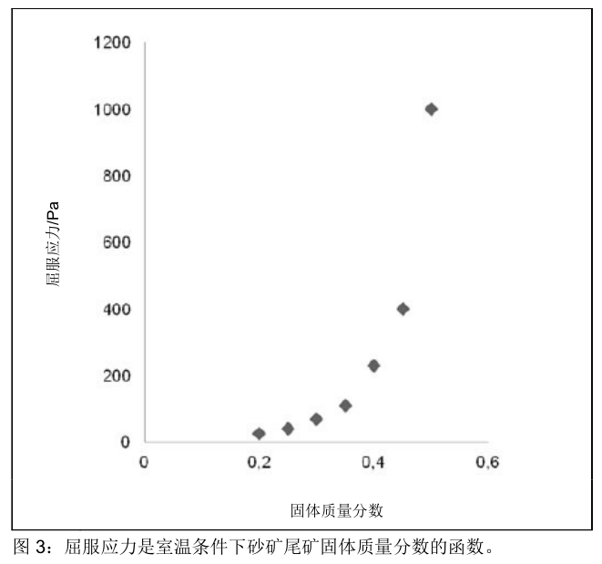 我們已采用這種簡單快速的方法,對固體質量分數各不相同(介于 0.2~0.5 之間)的砂礦尾礦進行了測試。測試結果如圖 3 所示,圖 3 顯示各屈服應力值與固體含量的關系曲線圖。使用圖 3 所示的少量測試得出的數據,計算經由管道橫截面所需的泵送壓力(巴)和屈服應力,即可方便地預測特定尾礦的可泵性。