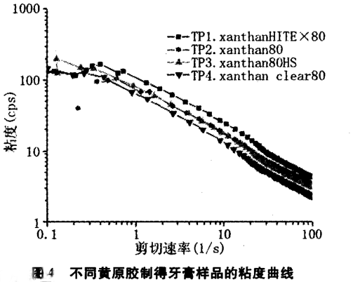 由圖 3 可知 ,不 同黃原膠制得 的牙膏樣 品粘度順序 :TPI—xanthan HITEX80> TP3 一xanthan 80HS> TP2 一xanthan80> TP4 一xanthan clear80 。