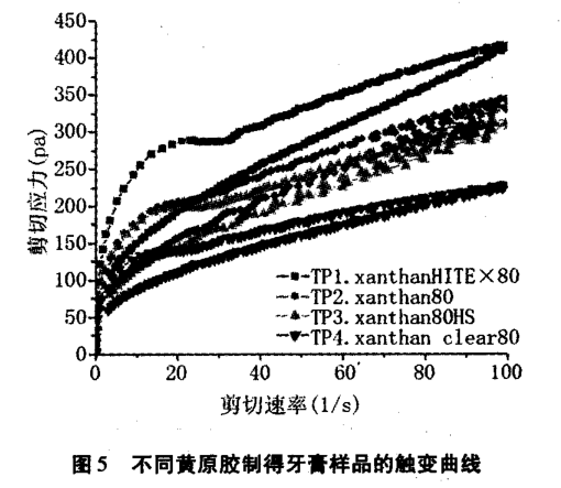 (2)將黃原膠與 CMC 復配使用 ,可得到不同流變性能的膏體,牙膏假塑性和觸變性大小為:TP1—xanthan HITEX80 > TP3 一 xanthan 80HS/TP2 一xnathan 80 >TP4 一xnathan clear80。說明黃原膠 HI一TEX80 與 CMC有更好的協同性,可以制作較好流動性,站立性和分散性的牙膏。