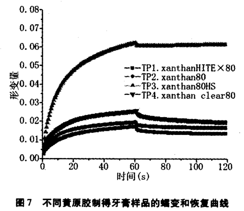 在很短的時間內樣品顯示出瞬間很大的形變,表明膏體具有彈性,在試驗時間內顯示出最小 量的變形,這兩點揭示樣品在貯存期間內膠水收縮作用較小,顯示了更好的穩定性。 由圖 7 可知, 當剪切應力消除時,四個樣品都未能恢復至原始水平。 形變量越小,則體系越穩定, 牙膏體系穩定性 :TP1>TP2> TP4 >一TP3。