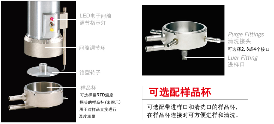 儀器組成:①儀器主機 ②支架 ③用戶選定的一支錐型轉(zhuǎn)子 ④樣品杯