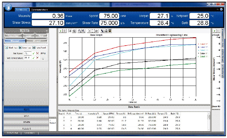 RheocalcT軟件可以用來分析數據,生成多層圖形,打印數據列表,運行數學模型以及一些其他的省時省力的例行功能。可繪制并保存高達5組的比較數據。