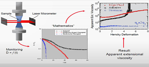 在傳統 CaBER 試驗中,往往使用激光測微尺,對上下兩板之間形成的(圓柱形)流體細絲,進行由表面張力誘導的細化(隨時間變化)測量,然后使用測得數據算出拉伸粘度數據。