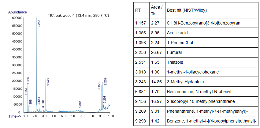 橡樹(shù)木熱裂解過(guò)程第一階段的總離子色譜圖,以及相關(guān)主峰的譜庫(kù)搜索結(jié)果如下(下表以滯留時(shí)間(RT/min)的升序排列):