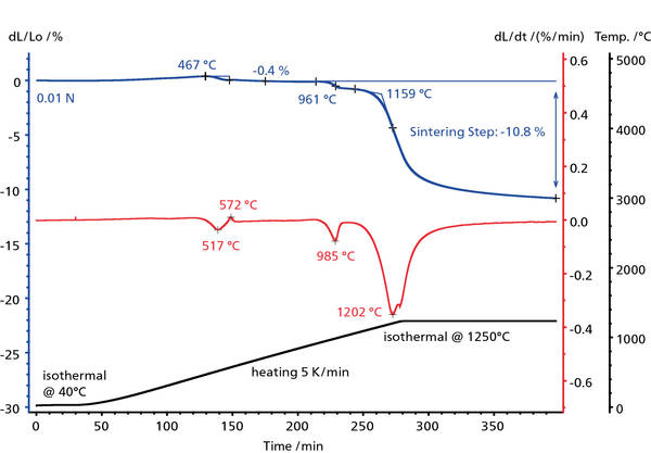 在瓷器生坯的加熱過程中,高嶺土的脫羥基過程發生在 450°C 至 570°C 之間,在這個過程中形成了莫來石結構(熱膨脹的峰值溫度為 467°C(藍色曲線),對應一階微分曲線上的峰值溫度為 517°C(紅色曲線))。在這個溫度范圍內,由于粘土晶體結構中結晶水的釋放從而導致了樣品大約 0.4% 的收縮。一階微分曲線上峰值溫度為 572°C 的峰體現了石英α晶型→β晶型的轉變。通過進一步觀察,在 961°C 發生的效應(藍色曲線),對應一階微分上峰值溫度為 985°C(紅色)的峰是由于高嶺土結構的破壞和 γ-Al2O3 的形成[1]。隨著長石的完全熔化和莫來石的形成,1159°C 開始的兩個燒結步驟的總收縮率為 10.8%。