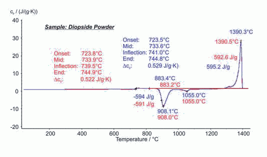圖中顯示的是透輝石玻璃粉末兩次測試的結(jié)果。玻璃化轉(zhuǎn)變發(fā)生在723°C~745°C之間,重結(jié)晶出現(xiàn)在883°C(起始點(diǎn)),熔融出現(xiàn)在1390°C(主峰溫度)。兩次測試分別取樣,得到的數(shù)據(jù)包括特征溫度和相應(yīng)的熱焓計(jì)算都吻合的很好,而且兩次測試過程中樣品比熱也基本無差別。這說明DSC 404 F1 Pegasus? 具有非常出色的穩(wěn)定性和測試重復(fù)性。