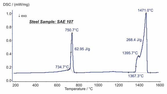 圖中顯示的是鋼(SAE 107)的相結(jié)構(gòu)轉(zhuǎn)變測量。在 751°C 前后,發(fā)生了兩種相互重疊的相變過程,735°C 之前熱流的平緩增大是由居里轉(zhuǎn)變(鐵磁性能的轉(zhuǎn)變)引起,而高而尖銳的主峰則由結(jié)晶結(jié)構(gòu)的改變(鐵素體轉(zhuǎn)變成奧氏體)所致,其相應(yīng)吸熱熱焓為 63J/g。在 1367°C 可以觀測到兩步熔融過程(峰值在 1395°C 與 1471°C),熔融熱焓為 268 J/g。