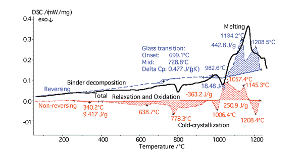 溫度調(diào)制 DSC(TM-DSC)是傳統(tǒng)上常用于測試聚合物低溫應(yīng)用的工具。STA 449 F1 Jupiter® 和 DSC 404 F1 Pegasus® 是市面上最早實(shí)現(xiàn)高溫溫度調(diào)制的儀器。下圖所示為絕緣礦物纖維的測試結(jié)果。在 DSC 總熱流曲線中,馳豫、氧化和玻璃化轉(zhuǎn)變是重疊的。只有從分離得到的 DSC 可逆熱流曲線上,才能準(zhǔn)確分析樣品的玻璃化轉(zhuǎn)變。