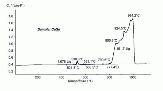 青銅合金是一種銅基合金,在古代人們就開始用它作為武器、容器或其他的金屬制品。今天它還經(jīng)常被做成軸承和彈簧元件。根據(jù)合金中錫的含量和添加劑的比例不同,合金的熔融行為會發(fā)生改變。圖中的合金樣品是用在滲透工藝中的。在521°C和568°C(起始點(diǎn))范圍內(nèi)樣品發(fā)生固相相變。熔融出現(xiàn)在777°C,整個熔程跨度超過200K,994°C后樣品完全熔化。