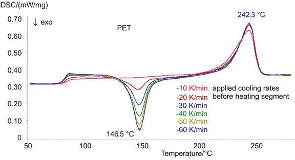 聚對苯二甲酸乙二醇酯(PET)是一種結晶速率相對較慢的半結晶性熱塑性高分子。在 DSC 中可以測出其非晶態部分(Tg 75°C~85°C)和晶態部分(重結晶 146°C,熔融 242°C)的不同比例。圖中顯示的是熔融后的 PET 以不同降溫速率冷卻后二次升溫的 DSC 譜圖,可見冷卻速率對 PET 結晶行為的影響。DSC 204 F1 可以自動計算出樣品的結晶度。這里使用的是配有機械制冷的 DSC 204 F1 Phoenix®。