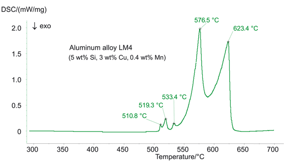 對于現代金屬合金分析而言,能夠很好的分開各個獨立組成的熔融峰是十分重要的,配有τ型傳感器的 DSC 204 F1 Phoenix® 便可以實現這一點。圖例是鋁合金DSC曲線,表明在 510°C~650°C 熔融范圍內各熔融峰之間清晰地被分離。