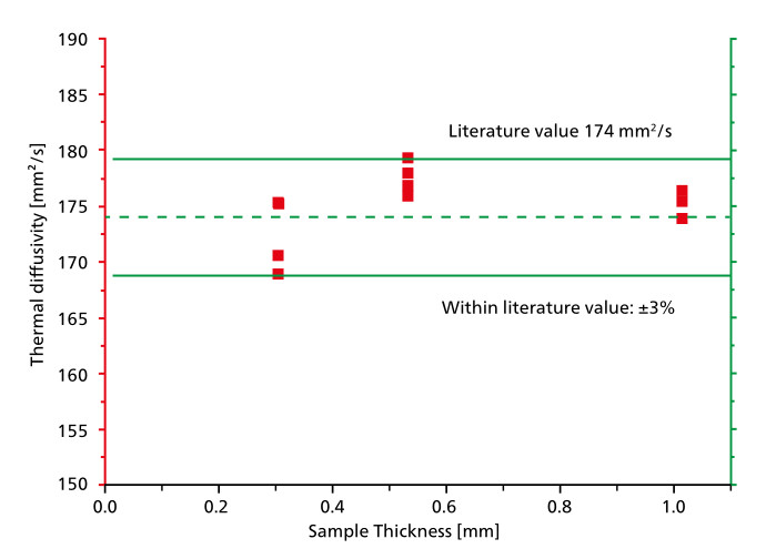 左圖對不同厚度銀片樣品進行熱擴散系數的對比測試。在 300K 的測試溫度下,不同厚度的樣品測試結果(從薄到厚)與文獻值相比,偏差均在 ±3% 以內。