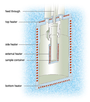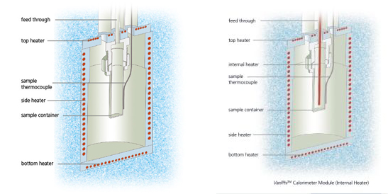 在管狀或球形容器中放置若干毫升的樣品。容器由完整的框架加熱系統(tǒng)所圍繞。在大多數(shù)測(cè)量模式下,框架加熱系統(tǒng)的溫度控制在與樣品溫度相同。此時(shí)在外圍加熱器與樣品之間沒(méi)有溫差,樣品釋放的所有熱量將停留在樣品內(nèi)部(即模擬絕熱環(huán)境)。