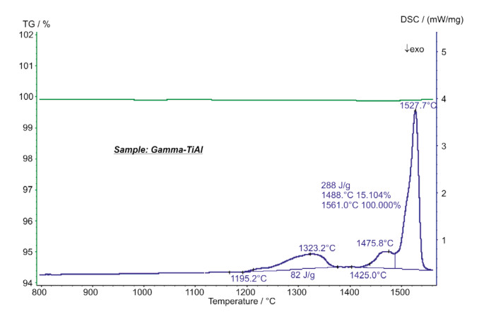 難熔合金 γ-TiAl 可通過高溫和低密度耐腐蝕測試進行鑒別。一般用于航空航天領域的渦輪充電器、燃氣渦輪和發動機。圖中 DSC 曲線顯示,在外推起始點溫度 1195°C 時有一吸熱效應(峰值溫度為1323°C),主要是 α2 →α 相轉變過程。在 1476°C(峰值溫度)時,α 相向 β相轉變。DSC曲線上 1528°C 時的吸熱峰主要是樣品的熔融過程(起始點溫度:1490°C,液相線溫度大約 1560°C)。在整個測試過程中,樣品質量無明顯變化。