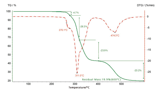 • 可對熱重曲線作一階微分(DTG)與二階微分,并可進行峰值溫度標注。
