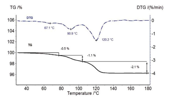 市售的硬脂酸鎂一般由幾種脂肪酸鹽按不同比例混合而成,被廣泛用作藥物的賦形劑。TGA 測(cè)試硬脂酸鎂在 200°C 溫度范圍內(nèi)有三個(gè)失重臺(tái)階:0.5%,1.1% 和 2.1%,若通過 TGA/FTIR 聯(lián)用分析儀,從對(duì)應(yīng)的譜圖即可初步判斷這三次失重均為水分的揮發(fā)。