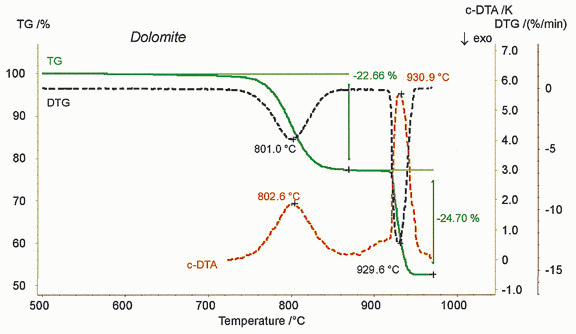 白云石(CaMg(CO3)2)在氮?dú)鈿夥障聹y(cè)試,其熱分解的失重臺(tái)階之間互相重疊;當(dāng)在 CO2 氣氛下測(cè)試,這些分解臺(tái)階就會(huì)被明顯分開。c-DTA 曲線則給出了進(jìn)一步的信息:這兩步分解均是吸熱分解。