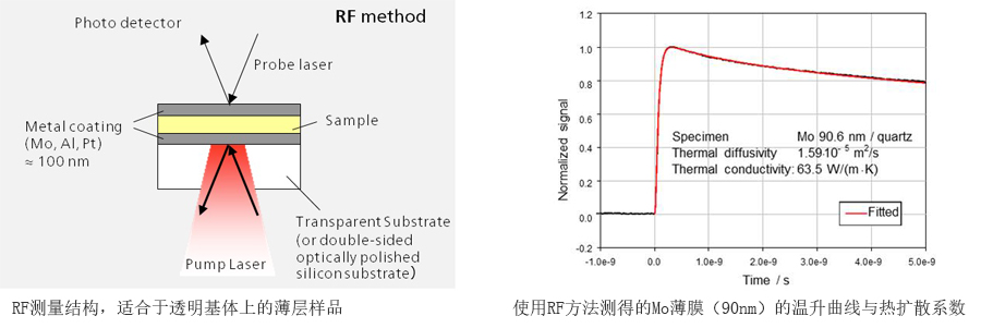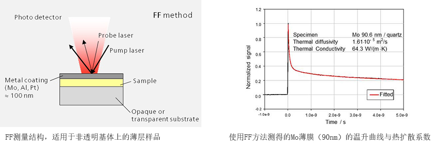 除了 RF 方法之外,測量也可以使用前部加熱/前部探測(FF)的結(jié)構(gòu)進(jìn)行。“Front”一詞這里指的是沉積于基體上的薄膜的外表面,而“Rear”一詞指的是薄膜與基體接觸的一面。
