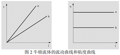 式中,F:A 面積上施加的力;η:粘度(viscosity)或粘度系數(viscosity coefficient),是表示流體粘性的物理常數。SI 單位中粘度用 Pas 表示;常用單位還有 mPas、P(泊)、cP(厘泊),其中 1P=0.1Pas,1cP=1mPas。根據公式可知牛頓液體的剪切速率與剪切應力 τ 之間關系,如圖 2 所示,呈直線關系,且直線經過原點。這時直線的斜率表示粘度,粘度與剪切速度無關,而且是可逆過程,只要溫度一定,粘度就一定。