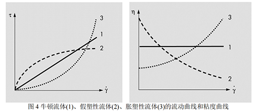 實際上大多數液體不符合牛頓定律,如高分子溶液、膠體溶液、乳劑、混懸劑、軟膏以及固-液的不均勻體系的流動均不遵循牛頓定律,因此稱之為非牛頓流體(non-Newtonian fluid),此種物質的流動現象稱為非牛頓流動(non-Newtonian flow)。對于非牛頓流體可以用旋轉粘度計測定其粘度,對其剪切應力 τ 隨剪切速率的變化作圖可得,如圖 3 和圖 4 中所示的流動曲線(flow curve)或粘度曲線(viscosity curve)。根據非牛頓流體流動曲線的類型把非牛頓流動分為塑性流動、假塑性流動和脹性流動三種。
