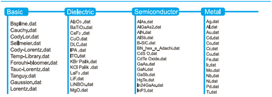 ■ 數(shù)百種材料數(shù)據(jù)庫(kù)、多種算法模型庫(kù),涵蓋了目前絕大部分的光電材料。
