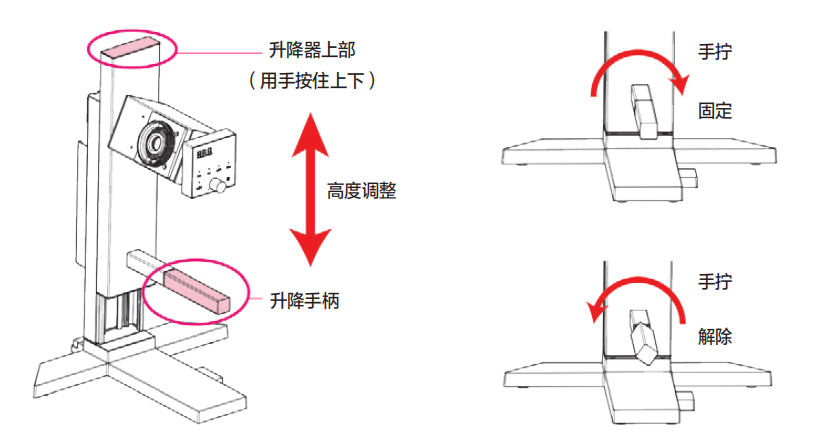 通過(guò)彈簧動(dòng)作的升降手柄調(diào)節(jié)本體高度。彈簧與玻璃套裝及配管連接,均衡受力,只需稍微用力便能實(shí)現(xiàn)升降。升降器的固定 /解除只需扭轉(zhuǎn)手柄即可。另外,由于確保了 200mm 的最大行程高度,蒸餾燒瓶的裝取非常方便。