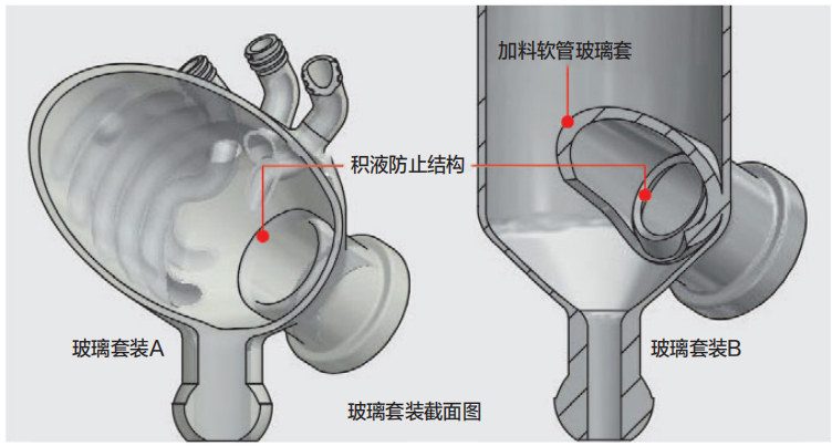 為了防止冷凝管中積留的冷凝液沿著內(nèi)壁浸入真空密封部,在冷凝管內(nèi)部的真空密封部前設(shè)計(jì)了防止積液的結(jié)構(gòu)。另外,玻璃套裝 B 考慮到加料軟管玻璃套內(nèi)側(cè)的結(jié)露,也設(shè)計(jì)了防止積液的結(jié)構(gòu)。通過(guò)防止積液流向真空部,從而提高了真空密封圈的使用壽命。