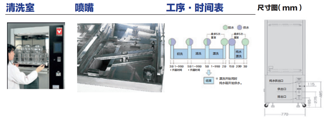 漂洗可單獨(dú)最多設(shè)置5次,純水50L漂洗可設(shè)定5次(需連接選配的純水供給裝置)。到達(dá)規(guī)定水量后開始清洗,到達(dá)設(shè)定溫度后開始時間計(jì)時。 |